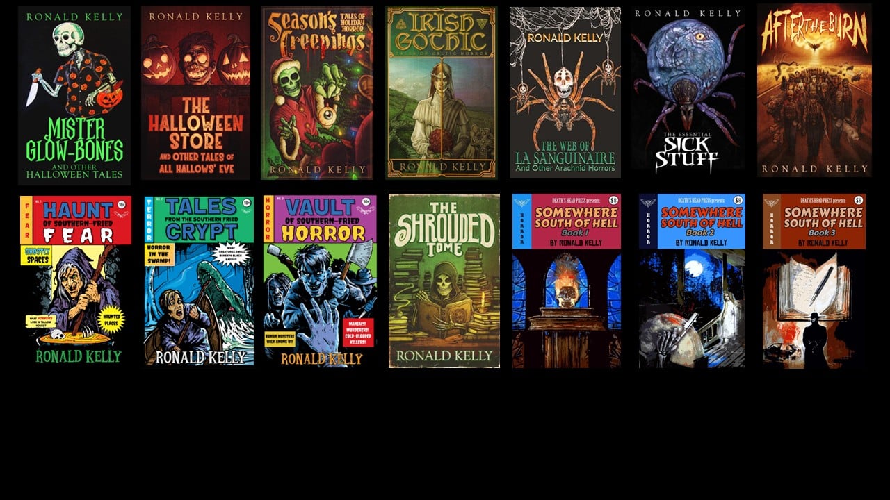 Get all fourteen RK short story collections in one set for 20% off the regular price! Collections include: Mister Glow-Bones, The Halloween Store, Season's Creepings, Irish Gothic, The Web of La Sanguinaire, The Essential Sick Stuff, After the Burn, Haunt of Southern-Fried Fear, Tales from the Southern-Fried Crypt, Vault of Southern-Fried Horror, The Shrouded Tome, and the three-chapbook set, Somewhere South of Hell.